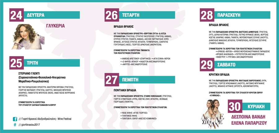 Η «Γιορτή Κρασιού 2017» μας υπόσχεται φέτος ακόμη μεγαλύτερες συγκινήσεις καθώς τη Δευτέρα 24 Ιουλίου την έναρξη της θα πραγματοποιήσει μια από τις κορυφαίες ελληνίδες τραγωδοποιούς η Γλυκερία ενώ την αυλαία θα κλείσουν η Δέσποινα Βανδή και η Έλενα Παπαρίζου.