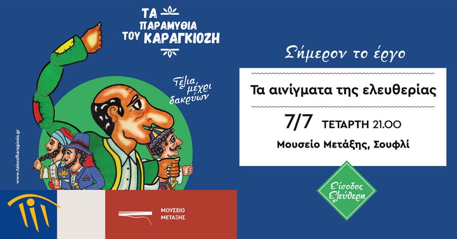 Με αφορμή τον εορτασμό των 200 χρόνων από την Επανάσταση του 1821, το Πολιτιστικό Ίδρυμα Ομίλου Πειραιώς (ΠΙΟΠ) παρουσιάζει, την Τετάρτη 7 Ιουλίου (ώρα 21:00), την παράσταση θεάτρου σκιών «Τα αινίγματα της ελευθερίας» με τους Απόστολο Δομτζίδη και Νατάσσα Μιχαηλίδου, στο Μουσείο Μετάξης, στο Σουφλί.