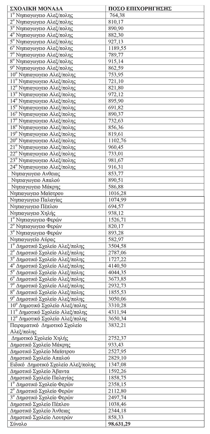 Το ποσό των 98.631 ευρώ κατανέμει με απόφασή της η Σχολικής Επιτροπή Πρωτοβάθμιας Εκπαίδευσης του Δήμου Αλεξανδρούπολης σε νηπιαγωγεία και δημοτικά της περιοχής.