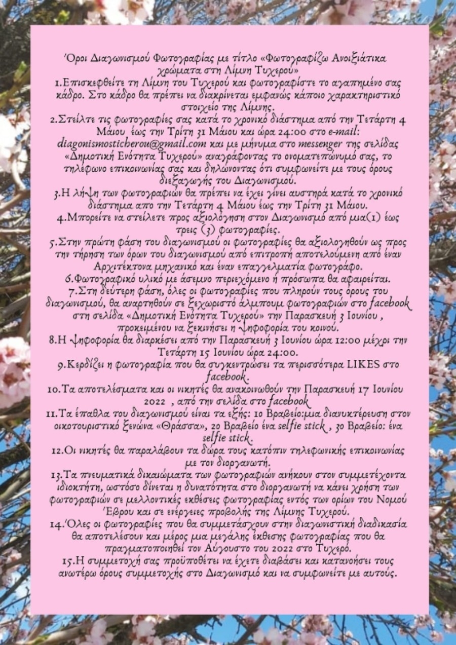 Μετά από ένα πετυχημένο διαγωνισμό φωτογραφία που πραγματοποιήθηκε τον Οκτώβριο και το Νοέμβριο του 2021 αλλά και το χειμώνα του 2022, όπου οι συμμετέχοντες φωτογράφισαν τα φθινοπωρινά και χειμερινά χρώματα στη Λίμνη Τυχερού, ξεκίνησε ήδη νέος διαγωνισμός με τίτλο "Φωτογραφίζω τα ανοιξιάτικα χρώματα στη Λίμνη του Τυχερού".