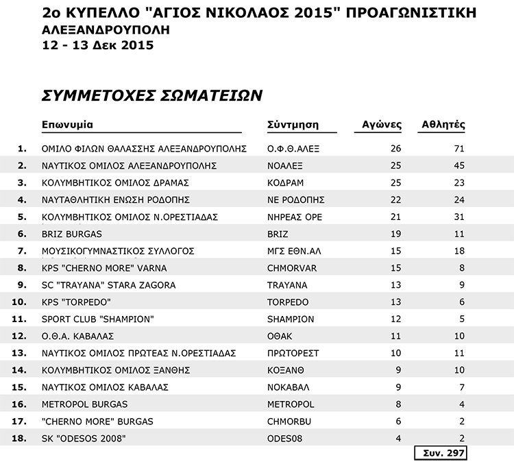 Ο Ναυταθλητικός Όμιλος Αλεξανδρούπολης φιλοξενεί στην πόλη μας τις αθλήτριες και τους αθλητές Αγωνιστικών και Προαγωνιστικών κατηγοριών από την Ελλάδα, την Τουρκία και την Βουλγαρία, που θα συμμετέχουν στο 2ο κύπελλο κολύμβησης «Άγιος Νικόλαος 2015».