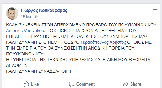 Ενδεικτικά το μήνυμα που εστειλε ο Αντιδήμαρχος Τεχνικών Υπηρεσιών και Υπηρεσίας Δόμησης κ. Γιώργος Κουκουράβας