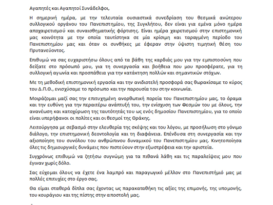 Αποχαιρετισμός του «υπηρεσιακού» Πρύτανη του Δ.Π.Θ Σταύρου Τουλουπίδη