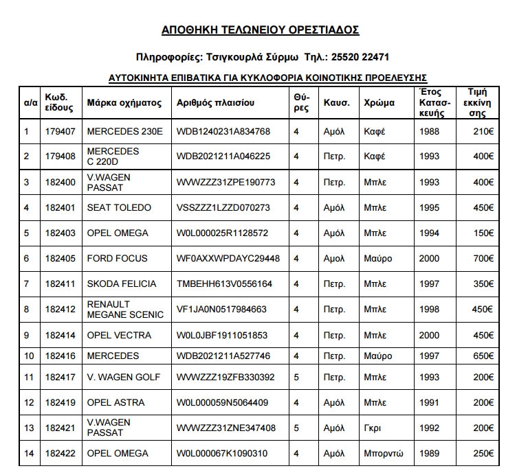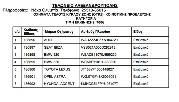 Να σημειωθεί πως η δημοπρασία αφορά οχήματα των Τελωνείων: Α΄ Θεσσαλονίκης, Βεροίας, Κομοτηνής, Καστοριάς, Δράμας, Ηγουμενίτσας, Σερρών, Ορεστιάδας, Κρυσταλλοπηγής, Ξάνθης, Αλεξανδρούπολης.
