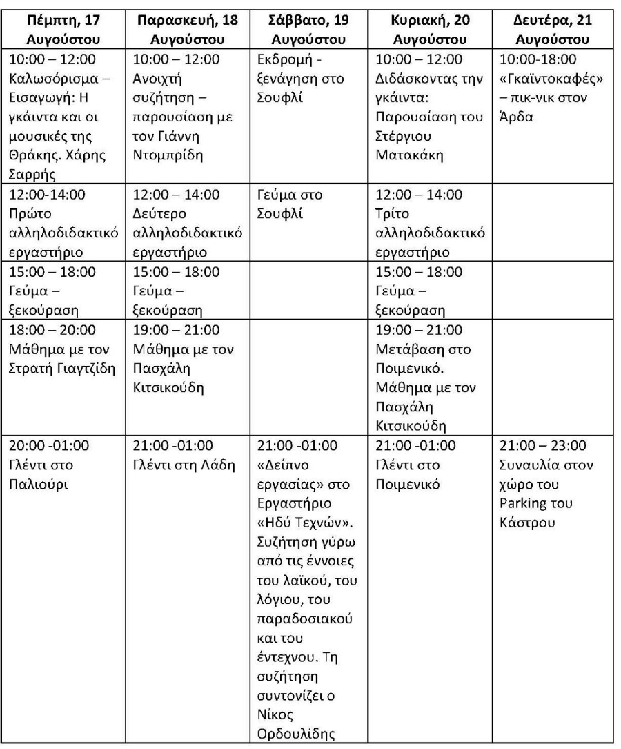 Τα εργαστήρια και τα θεωρητικά μαθήματα θα λάβουν χώρα στο εντυπωσιακό κτήριο του 1ου Δημοτικού Σχολείου, χτισμένου το 1911. Τρία γλέντια σε τρία διαφορετικά χωριά και μια εκδρομή συμπληρώνουν το πρόγραμμα, διαχέοντας τις δράσεις του Σεμιναρίου στην τοπική κοινωνία. Ποιος καλύτερος τρόπος υπάρχει για να αντλήσει κανείς γνώση και εμπειρία από το βιώσει την μουσική που μελετά να λειτουργεί σε πραγματικό τόπο και χρόνο; Την εικόνα συμπληρώνουν οι "γκαϊντοκουβέντες" και η διάδραση των συμμετεχόντων στον φιλόξενο ξενώνα του Δήμου Διδυμοτείχου, ο οποίος γι’ άλλη μια φορά στηρίζει το Σεμινάριο.