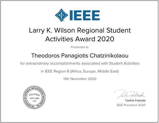 Με το βραβείο MGA IEEE Larry K. Wilson Regional Student Activities Award 2020, τιμήθηκε ο κ.Θεόδωρος Παναγιώτης Χατζηνικολάου, Υποψήφιος Διδάκτωρ και απόφοιτος του Τμήματος Ηλεκτρολόγων Μηχανικών και Μηχανικών του Δημοκριτείου Πανεπιστημίου Θράκης.