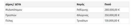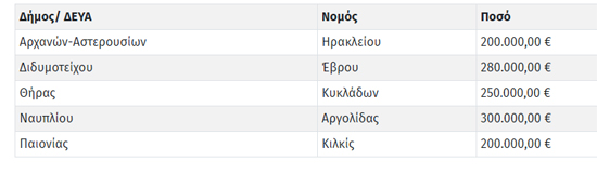 Ακολούθως, με χρέωση του αντίστοιχου λογαριασμού του ΥΠΕΣ, που τηρείται στο Ταμείο Παρακαταθηκών και Δανείων, εγκρίθηκαν οι κάτωθι επιχορηγήσεις ύψους 660.000,00 ευρώ για τη χρηματοδότηση των αναγκαίων εργασιών με σκοπό την αντιμετώπιση του φαινομένου της λειψυδρίας.