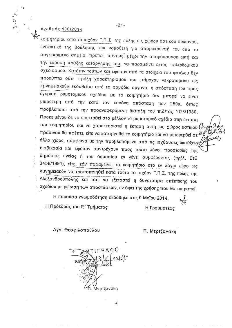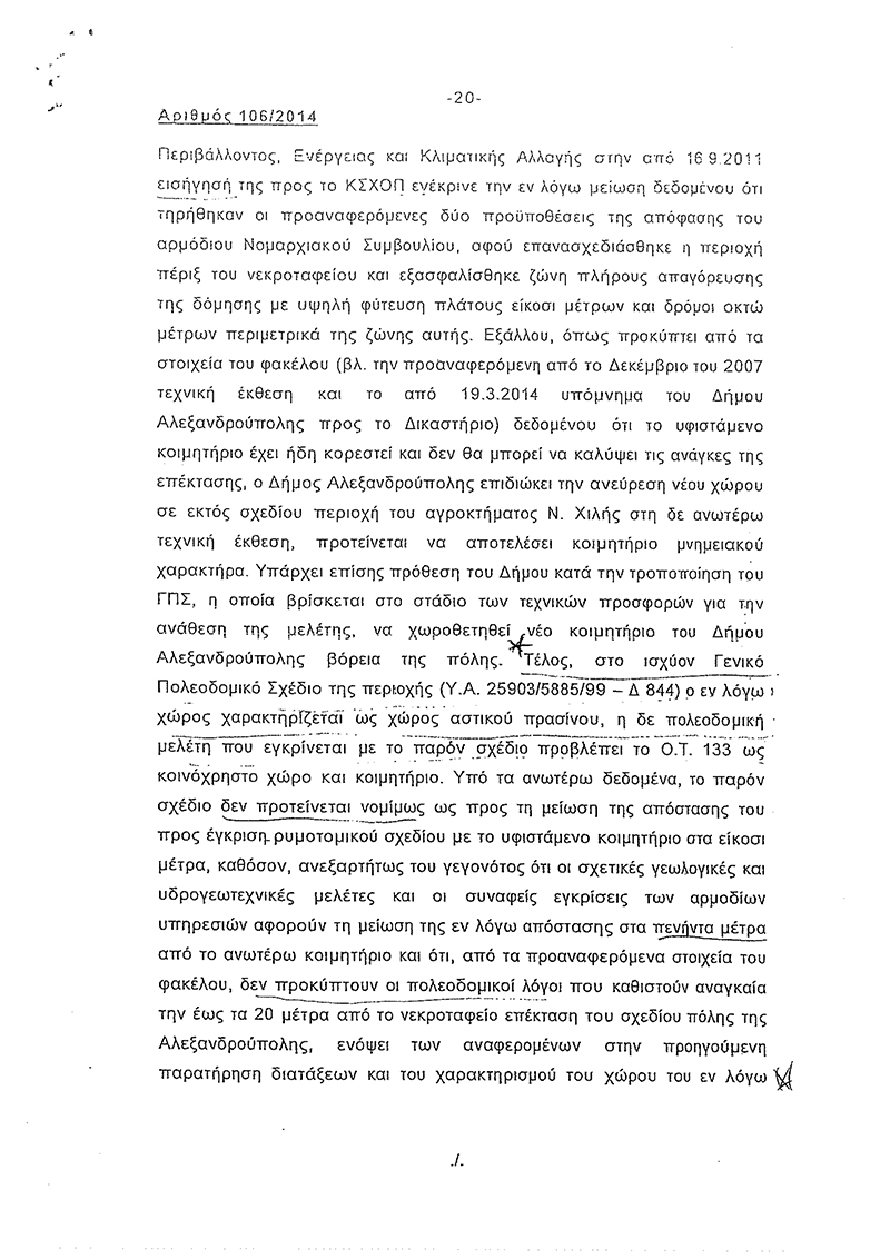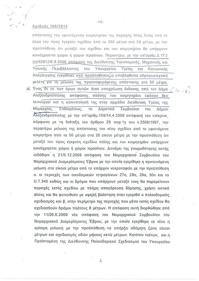 "Πανηγυρίζει η δημοτική αρχή την επιτυχία της για το σχέδιο πόλης που αφορά την επέκταση της Χιλής-Καλλιθέας 3000 στρεμμάτων με το υπ αρ. 27 AAΠ/26/02/2016 Φύλλο της Εφημερίδας της Κυβερνήσεως και μάλιστα μετά από πολυετείς αγώνες!! Από πέρσι τον Ιανουάριο τυχαία μας έγινε γνωστό ότι με γνωμοδότηση του Συμβουλίου της Επικρατείας με αριθμό πρωτοκόλλου 106/2014 που εκδόθηκε στης 9-5-2014 δηλαδή άλλο ένα σχεδόν χρόνο πριν , τα οικόπεδα που είναι 250 μέτρα από το νεκροταφείο της Χιλής βόρεια,νότια,ανατολικά,δυτικά και διευκρινίζω χωρίς σε αυτό να αποτελεί εξαίρεση ο εθνικός δρόμος που χωρίζει τα νεκροταφεία από τα οικόπεδα , θα παραμείνουν εκτός σχεδίου πόλεως παρότι ήταν φυσικά ενταγμένα , περασμένα από της αρμόδιες υπηρεσίες ΣΧΟΟΑΠ του υπουργείου περιβάλλοντος . Για ποίο λόγο όμως γνωμοδότησε έτσι; Παρακάτω σας παραθέτω απόσπασμα της γνωμοδότησης του συμβουλίου της επικρατείας που από την ανάγνωση του φαίνεται πως έχει μεγάλες ευθύνες ο δήμος Αλεξανδρούπολης καθώς και ο χωροτάκτης πολεοδόμος του δήμου . 1) Για ποιο λόγο δεν μας έγινε γνωστό από τον δήμο Αλεξ/πολης (τους ιδιοκτήτες που μας αφορά ) αυτή η γνωμοδότηση του συμβουλίου της επικρατείας και το μάθαμε τυχαία μετά από ένα χρόνο περίπου ; 2) Για ποιο λόγο δεν τήρησε έν εκ των όρων ο δήμος Αλεξ/πολης που ήταν η έκδοση απόφασης παύσης του κοιμητηρίου με την οποία η απόσταση ένταξης από το κοιμητήριο θα έφτανε τα 20 μέτρα; Για ποίο λόγο ο δήμος Αλεξ/πολης αμέλησε και καταδικάζει δεκάδες οικογένειες σε αναμονή πολλών ακόμα ετών; 3)Για ποιο λόγο ο δήμαρχος Αλεξ/πολης αρχικά αρνήθηκε την συζήτηση του θέματος στο δημοτικό συμβούλιο στης 09-02-2015 και τελικώς Μέτα από πιέσεις αναγκάστηκε να συζητηθεί; 4) Για ποιο λόγο ο υπεύθυνος Χωροτάκτης - Πολεοδόμος δεν αντιλήφθηκε το πρόβλημα που υπήρχε χρόνια πριν και δεν μερίμνησε στην λύση του , πριν φτάσουμε στο τελικό σημείο αρνητικής γνωμοδοτικής απόφασης του ΣΤΕ";