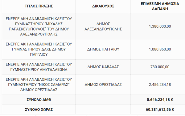 Με 60  εκατ. ευρώ πρόκειται να χρηματοδοτηθούν 58 έργα στο πλαίσιο της πρόσκλησης «Ενεργειακή αναβάθμιση Δημοσίων Κτιρίων – Δράσεις Ενεργειακής Αναβάθμισης και Εξοικονόμησης Ενέργειας (ΕΞΕ) και Αξιοποίησης Ανανεώσιμων Πηγών Ενέργειας (ΑΠΕ) σε Αθλητικές Εγκαταστάσεις»  του Επιχειρησιακού Προγράμματος «Υποδομές Μεταφορών, Περιβάλλον και Αειφόρος Ανάπτυξη» του Υπουργείου Οικονομίας και Ανάπτυξης.