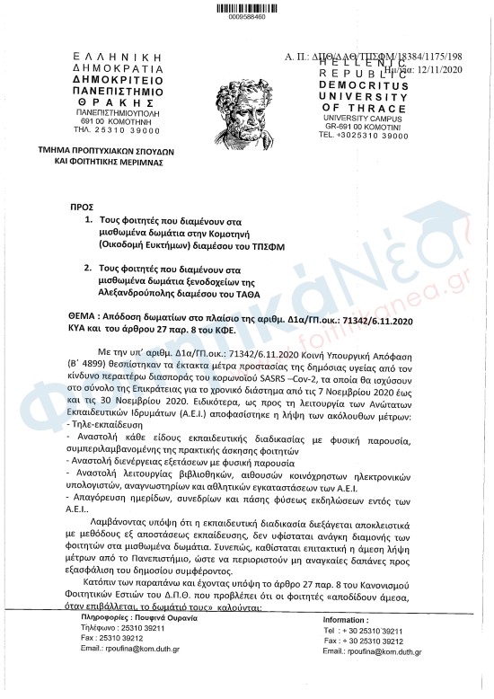 Η διοίκηση του ΔΠΘ ζητά από τους φοιτητές σε Κομοτηνή και Αλεξανδρούπολη να εκκενώσουν τα δωμάτια εστίας εντός 3 ημερών