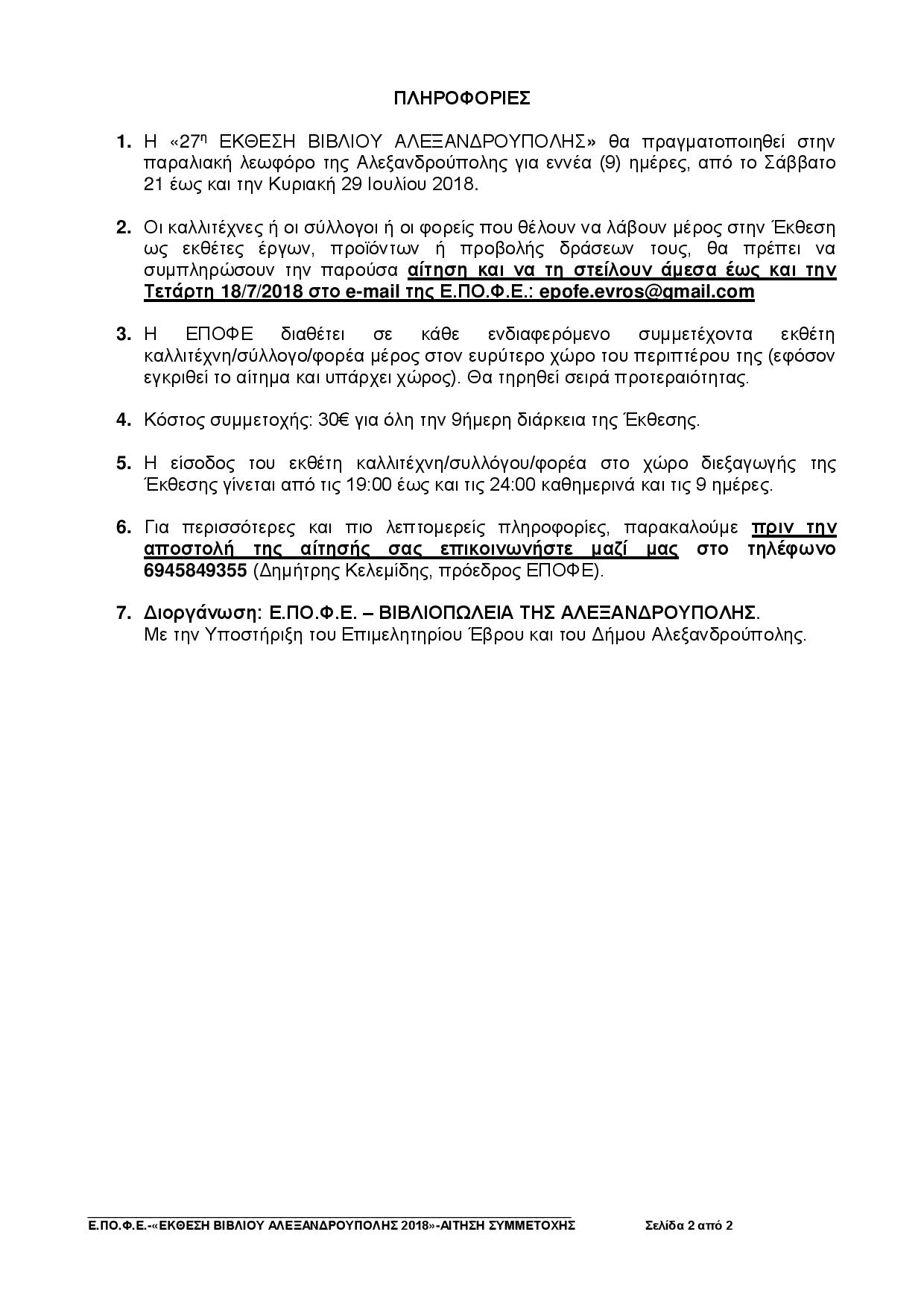 Η Ένωση Πολιτιστικών Φορέων Έβρου, ως διοργανώτρια αρχή, απευθύνει κάλεσμα προς όλους τους συλλόγους και φορείς να συμμετέχουν στη διοργάνωση, ως εκθέτες έργων, προϊόντων ή προβολής δράσεων τους, να πρέπει να συμπληρώσουν αίτηση και να τη στείλουν άμεσα έως και την Τετάρτη 18/7/2018 στο e-mail της Ε.ΠΟ.Φ.Ε.: epofe.evros@gmail.com.