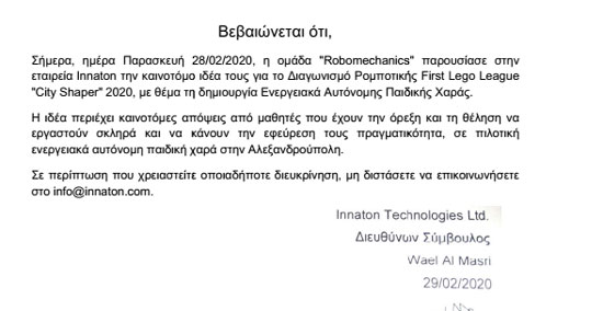 Την ίδια ώρα η Κυπριακή Εταιρία "Innaton Technologies" με τον Διευθύνων Σύμβουλο "Wael Al Masri" έδωσε και αυτή με την σειρά της Έγγραφη βεβαίωση, ότι πρόκειται για μια εξαιρετική, καινοτόμα αλλά και υλοποιήσιμη ιδέα.