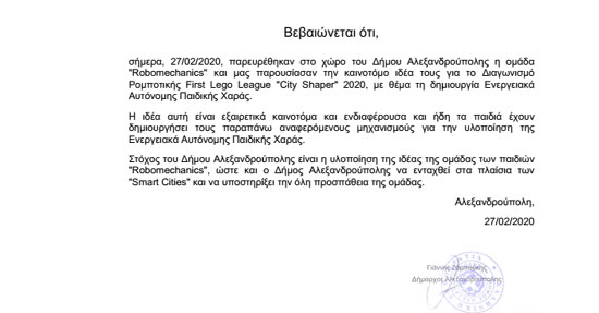 Η καινοτόμος ιδέα της Ομάδας Ρομποτικής, "RoboMechanics", "Ενεργειακά Αυτόνομες Παιδικές Χαρές" παρουσιάστηκε στον Δήμο Αλεξανδρούπολης.