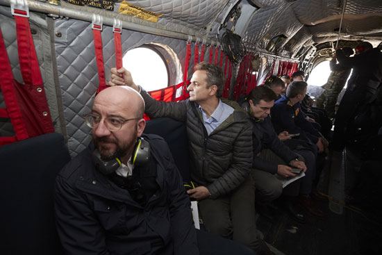 Στη συνέχεια, ο Πρωθυπουργός και οι Ευρωπαίοι αξιωματούχοι επιβιβάστηκαν σε ελικόπτερο για να πετάξουν πάνω από τα χερσαία σύνορα με την Τουρκία και στις 14:15 θα προσγειωθούν στην περιοχή της Ορεστιάδας, όπου θα επισκεφτούν το Φυλάκιο 1. Θα ακολουθήσει ενημέρωση από τον Αρχηγό ΓΕΕΘΑ Στρατηγό Κωνσταντίνο Φλώρο.