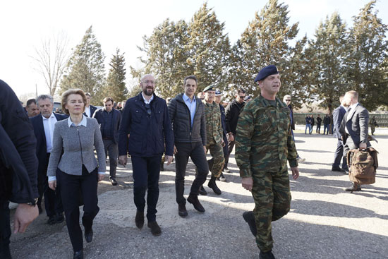 Σε σύντομη συζήτηση που είχε με τους επικεφαλής των Ευρωπαϊκών θεσμών στο αεροδρόμιο, ο Κυριάκος Μητσοτάκης τους ενημέρωσε για την κατάσταση που επικρατεί στα σύνορα της Ελλάδας, που είναι ταυτόχρονα σύνορα της Ευρώπης.