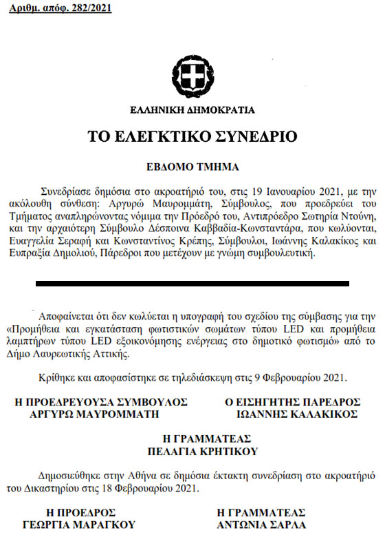 Νόμιμοι, απολύτως εύλογοι και ανάλογοι του αντικειμένου της σύμβασης, κρίθηκαν όλοι οι όροι και τα κριτήρια επιλογής αναδόχου της διακήρυξης “Προμήθειας φωτιστικών LED” του Δήμου Λαυρεωτικής από το Ανώτατο Δικαστήριο της Χώρας.