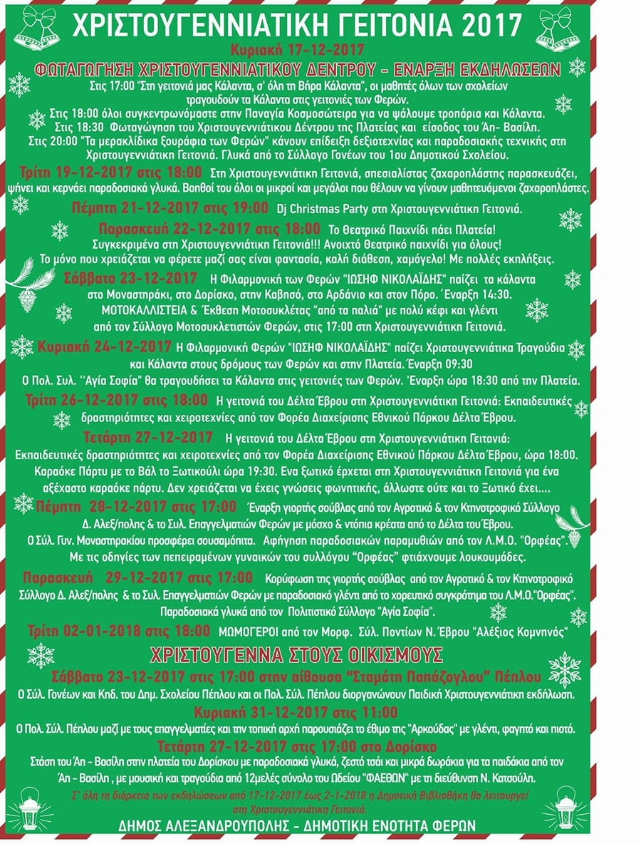 Την Κυριακή 17Δεκεμβρίου στις 18:30 το απόγευμα θα γίνει η φαντασμαγορική έναρξη των Χριστουγεννιάτικων εκδηλώσεων με το πανηγυρικό άναμμα του Χριστουγεννιάτικου Δέντρου στην πλατεία των Φερών.