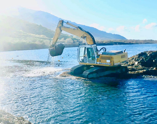 "Χθεσινός καθαρισμός της μπούκας του αλιευτικού καταφυγίου στα Θέρμα Σαμοθράκης από ερπυστριοφόρο μηχάνημα και προσωρινή αποκατάσταση, καθώς το περασμένο Σάββατο μεγάλη μάζα από φύκια μπλόκαρε την έξοδο και εγκλώβισε αλιευτικά σκάφη εντός.