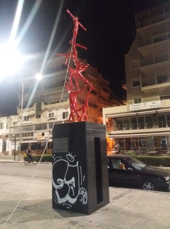 Άγνωστη παραμένει η ταυτότητα των «δραστών» που μάλλον το γλυπτό δεν συνάδει με την…αισθητική τους, και θέλησαν να το ρίξουν, χωρίς όμως να το επιτύχουν.