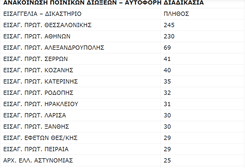 Όσον αφορά την γεωγραφική κατανομή των ποινικές υποθέσεων, την “πρωτιά” κατέχει η Θεσσαλονίκη με 245, ακολουθεί η Αθήνα με 230, η Αλεξανδρούπολη (69), οι Σέρρες (41), η Κοζάνη (40) και η Κατερίνη (35).