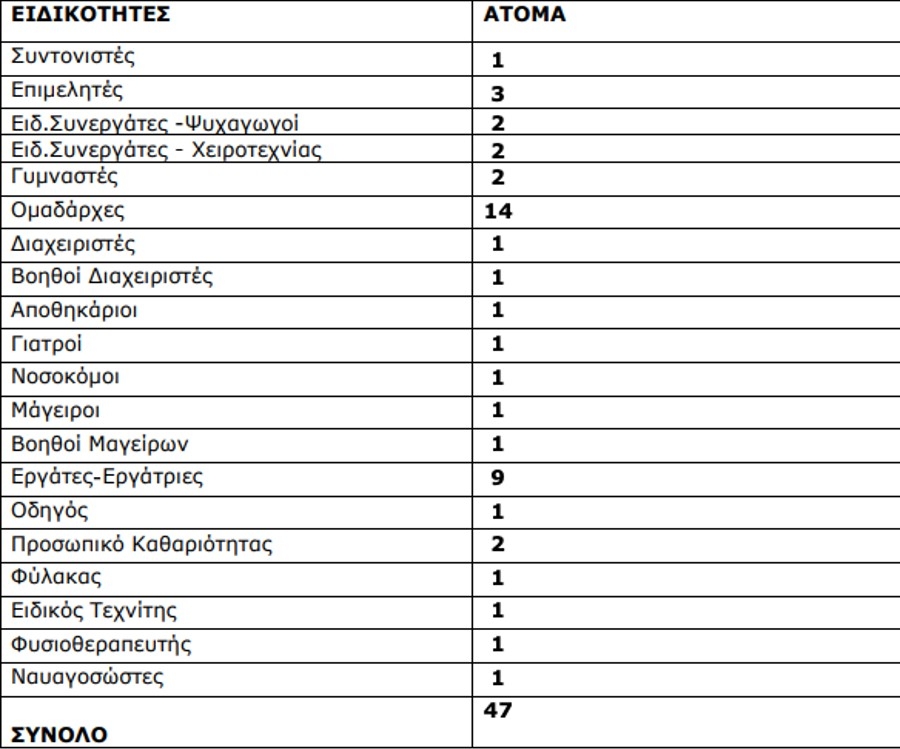 Aκολουθεί αναλυτικός πίνακας με τις ειδικότητες: