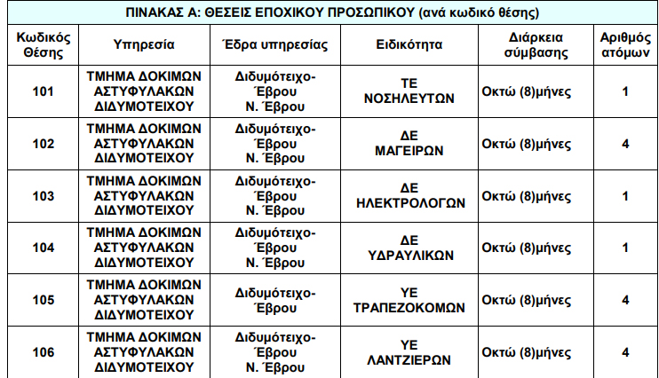 Ανακοινώθηκε η πρόσληψη, με σύμβαση εργασίας ιδιωτικού δικαίου ορισμένου χρόνου, συνολικά δέκα πέντε (15) ατόμων για την κάλυψη εποχικών ή παροδικών αναγκών του Τμήματος Δοκίμων Αστυφυλάκων Διδυμοτείχου, που εδρεύει στο Δήμο Διδυμοτείχου του Νομού Έβρου, και συγκεκριμένα του εξής, ανά Υπηρεσία, έδρα, ειδικότητα και διάρκεια σύμβασης, με τα αντίστοιχα απαιτούμενα.