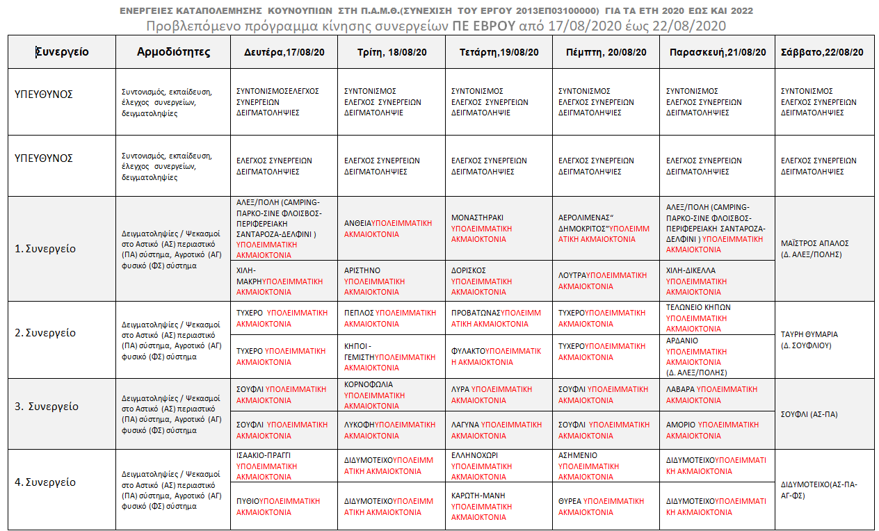 Το προβλεπόμενο πρόγραμμα κίνησης συνεργείων από την Περιφέρεια Έβρου. Συνεχίζουν οι επίγειοι ψεκασμοί κουνουπιών την Τρίτη 18 Αυγούστου έως το Σάββατο στις 22 Αυγούστου.