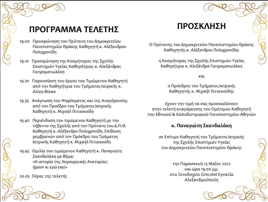 Η αναγόρευση του τιμώμενου θα γίνει από τον Πρύτανη του Δημοκριτείου Πανεπιστημίου Θράκης Καθηγητή κ. Αλέξανδρο Πολυχρονίδη και θα ακολουθήσει ομιλία του τιμώμενου με θέμα: «Η ιστορία της Χειρουργικής Ανατομίας: ήμουν κι εγώ εκεί».