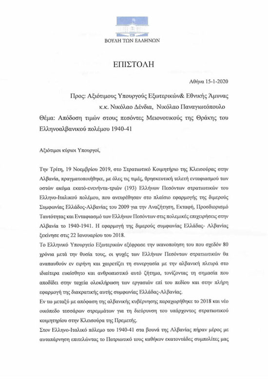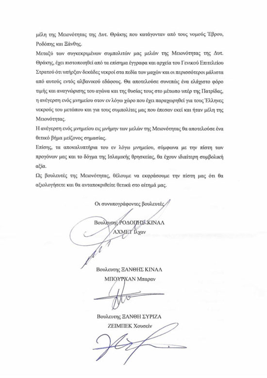 "Στον Ελληνο-Ιταλικό πόλεμο του 1940-41 στα βουνά της Αλβανίας πήραν μέρος με αυταπάρνηση, επιτελώντας το πατριωτικό τους καθήκον εκατοντάδες συμπολίτες μας μέλη της Μειονότητας της Δυτ. Θράκης που κατάγονταν από τους νομούς Έβρου, Ροδόπης και Ξάνθης. Μεταξύ των συγκεκριμένων συμπολιτών μας, μελών της Μειονότητας της Δυτ. Θράκης, έχει πιστοποιηθεί από τα επίσημα έγγραφα και αρχεία του Γενικού Επιτελείου Στρατού, ότι υπήρξαν δεκάδες νεκροί στα πεδία των μαχών, και οι περισσότεροι μάλιστα από αυτούς εντός Αλβανικού εδάφους. Θα αποτελούσε συνεπώς έναν ελάχιστο φόρο τιμής και αναγνώρισης του αγώνα και της θυσίας τους υπέρ της Πατρίδας, η ανέγερση ενός μνημείου στον χώρο που έχει παραχωρηθεί από το Αλβανικό κράτος για τους Έλληνες νεκρούς του μετώπου, και για τους συμπολίτες μας που έπεσαν εκεί και ήταν μέλη της Μειονότητας της Θράκης. Η ανέγερση ενός μνημείου εις μνήμην των μελών της Μειονότητας, θα αποτελέσει ένα βήμα μείζονος σημασίας", αναφέρουν μεταξύ άλλων στην κοινή τους επιστολή οι βουλευτές.
