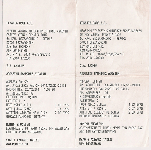 Στάση για καφέ στη Μουσθένη της Καβάλας, πάλι στο δρόμο και στις 11 και 7, διόδια στην Ανάληψη. Άλλα δύο ευρώ.