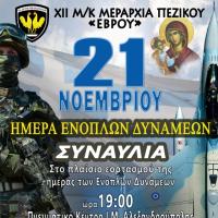 Η ΧΙΙ Μηχανοκίνητη Μεραρχία Πεζικού "ΕΒΡΟΥ" ανακοινώνει ότι, στο πλαίσιο του εορτασμού της Ημέρας Ενόπλων Δυνάμεων, διοργανώνει εκδήλωση με τη συμμετοχή της Στρατιωτικής Μουσικής της Μεραρχίας και της χορωδίας "Φωνές της Θράκης". Η εκδήλωση θα πραγματοποιηθεί την Τρίτη 21 Νοεμβρίου 2017...