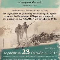 Ο Πανελλήνιος Σύνδεσμος Εθελοντών Πολεμιστών Εκστρατευτικών Σωμάτων Στρατού, Ναυτικού, Αεροπορίας και απογόνων Μέσης Ανατολής "ΕΛ -ΑΛΑΜΕΪΝ", το βιβλιοπωλείο "Ελευθερουδάκης"- Φωτεινή Σκαρλακίδου και το Ιστουρικό Μουσείο Αλεξανδρούπολης σας προσκαλούν στην εκδήλωση Μνήμης και Τιμής: "Οι Αγωνιστές της Εθνικής Αντίστασης του Έβρου...