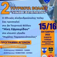 Στις 15-16 Οκτωβρίου ο Εθνικός Αλεξανδρούπολης θα διοργανώσει το δεύτερο τουρνουά βόλεϊ «Νίκη Εφραιμίδου» στο κλειστό γήπεδο «Μιχάλης Παρασκευόπουλος». Η Νίκη Εφραιμίδου, «η κυρία Νίκη» όπως την αποκαλούσαν όλοι στο χώρο ήταν μια ακούραστη εργάτρια του βόλεϊ στην Αλεξανδρούπολη και...