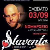 Το Σάββατο 3 Σεπτεμβρίου το αγαπημένο μας συγκρότημα "Stavento" θα βρίσκεται στην Αλεξανδρούπολη για να μας χαρίσει μια μοναδική συναυλία μαζί με την Σοφία Κουρτίδου. Η μουσική βραδιά πραγματοποιείται στα πλαίσια των δραστηριοτήτων που διοργανώνει η Περιφερειακή Ενότητα Έβρου για...