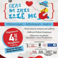 "Θέλω να Ζήσω_Σώσε Με" είναι το κεντρικό μήνυμα που θα στείλουν οι ΜΑΘΗΤΈΣ από τα Δημοτικά σχολεία και το Μουσικό Γυμνάσιο της πόλης μας, στην ομώνυμη Πολιτιστική Δράση κοινωνικού χαρακτήρα την ΠΑΡΑΣΚΕΥΗ 4 ΝΟΕΜΒΡΙΟΥ 2016 και από ώρα 11:00 το...
