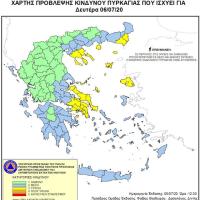 Σύμφωνα με το Χάρτη Πρόβλεψης Κινδύνου Πυρκαγιάς που εκδίδει η Γενική Γραμματεία Πολιτικής Προστασίας του Υπουργείου Εσωτερικών (www.civilprotection.gr), για αύριο Δευτέρσ 6 Ιουλίου 2020, προβλέπεται υψηλός κίνδυνος πυρκαγιάς (κατηγορία κινδύνου 3) για τις εξής περιοχές: Αττική, Εύβοια, Βοιωτία, Σποράδες, Χαλκιδική, Έβρο, Θάσο...