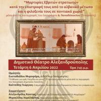 Ο Μορφωτικός Σύλλογος Ποντίων Ν. Εβρου "ΑΛΕΞΙΟΣ ΚΟΜΝΗΝΟΣ" μας προσκαλεί στην εκδήλωση "Μαρτυρίες Εβριτών στρατιωτών κατά την επιστροφή τους από το αλβανικό μέτωπο και η φιλοξενία τους σε ποντιακά χωριά", μέσα από τις καταγραφές του Λαογράφου Δημητρίου Παπαδόπουλου (Σταυριώτη) την...