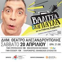 Το Σάββατο 20 Απριλίου στις 21:00 μ.μ. ακριβώς, θα δοθεί στην Αλεξανδρούπολη, στο Δημοτικό Θέατρο, η πολυαναμενόμενη και πολυδιαφημιζόμενη παράσταση του Γιάννη Σερβετά. Μια παράσταση λεκτικό στριπτίζ που θα’ ναι… σα να μπαίνει η άνοιξη! Μια παράσταση που θα σου δώσει...