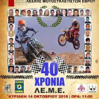 Την Κυριακή 14 Οκτωβρίου 2018 θα διεξαχθεί στην Αλεξανδρούπολη ο 1ος αγώνας Moto Cross Βορείου Ελλάδος της Α.ΜΟΤ.Ο.Ε. Ο Αγώνας θα γίνει στην παραλία του Απαλού και οργανώνεται από την Λέσχη Μοτοσικλετιστών Έβρου (ΛΕΜΕ) η οποία κλείνει...
