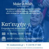 Το Make-A-Wish (Κάνε-Μια-Ευχή Ελλάδος) εκπληρώνει ευχές παιδιών 3-18 ετών με πολύ σοβαρές ασθένειες, με σκοπό να τους χαρίσει δύναμη για να συνεχίσουν να αγωνίζονται για τη ζωή τους. Την Τετάρτη 31 Μαΐου και ώρα 18:00 – 20:00, ο οργανισμός σας...
