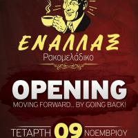 Το Εναλλάξ ανοίγει και πάλι τις πόρτες του κι επιστρέφει ξανά όπως το γνωρίσαμε και το αγαπήσαμε. Την Τετάρτη 9 Νοεμβρίου, λίγο μετά τις 20:00, ετοιμαστείτε για το μεγάλο opening "Μοving Forward...By going Back". To αγαπημένο μας ρακομελάδικο ξαναγίνεται...