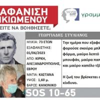 Ο Γεωργιάδης Στυλιανός, 73 ετών, εξαφανίστηκε από το σπίτι του, στην Κίρκη Αλεξανδρούπολης, στον Έβρο, την 01/06/23. Έχει λευκά μαλλιά, καστανά μάτια, ύψος 1,60μ και είναι κανονικού βάρους. Την ημέρα της εξαφάνισης, φορούσε σκούρα μπλε φόρμα, μαύρο λεπτό μπουφάν...
