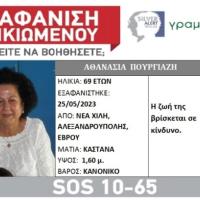 Η Αθανασία Πουργιάζη, 69 ετών, εξαφανίστηκε από το σπίτι της, στη Νέα Χιλή Αλεξανδρούπολης, στον Έβρο, στις 25/05/23. Έχει καστανά μάτια, ύψος 1,60μ και είναι κανονικού βάρους. @@BANNER9@@ Η ΓΡΑΜΜΗ ΖΩΗΣ, ειδοποιήθηκε από τους οικείους της το βράδυ της...