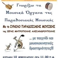 Το Σύνολο Παραδοσιακής Μουσικής της Ιεράς Μητροπόλεως Αλεξανδρούπολης προσκαλεί ΟΛΑ τα παιδιά της πόλης μας για να γνωρίσουν από καθηγητές μουσικής – μουσικοπαιδαγωγούς και οργανοπαίκτες της δημοτικής μας μουσικής, μέσα από την ακρόαση, την άμεση επαφή με τα όργανα, το παιχνίδι...