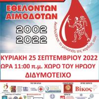 Την Κυριακή 25 Σεπτεμβρίου 2022 στο Διδυμότειχο θα πραγματοποιηθεί η 20η Λαμπαδηδρομία των Εθελοντών Αιμοδοτών, που διοργανώνει ο ΣΕΑ Διδυμότειχου «Αγία Ειρήνη Χρυσοβαλάντου», σε συνεργασία με την Ένωση Συλλόγων και Ομάδων Εθελοντών Αιμοδοτών Ν. Έβρου, υπό την Αιγίδα της Πανελλήνιας...