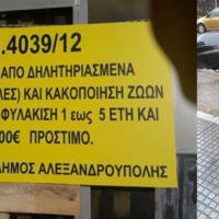 “Θανάτωση από δηλητηριασμένα δολώματα (φόλες) και κακοποίηση ζώων τιμωρείται με φυλάκιση 1 έως 5 έτη και 30.000 ευρώ πρόστιμο”: Αυτό αναγράφεται σε μία εκ των τεσσάρων πινακίδων του Δήμου Αλεξανδρούπολης, που στήθηκε στα Δίκελλα κατόπιν έντονων προσπαθειών και παροτρύνσεων...
