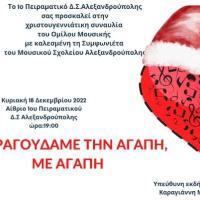 To 1ο Πειραματικό Δημοτικό Σχολείο Αλεξανδρούπολης και ο Όμιλος Μουσικής του σχολείου, σας καλούν την Κυριακή, 18 Δεκεμβρίου 2022 και ώρα 19.00, στο αίθριο του σχολείου, να παρακολουθήσετε τη χριστουγεννιάτικη συναυλία. // Η εκδήλωση θα πραγματοποιηθεί με τη σύμπραξη...