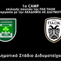 Η Ακαδημία ποδοσφαίρου Α.Ε. Διδυμοτείχου ανακοινώνει ότι το Σάββατο, 9 Μαΐου 2015, θα πραγματοποιηθεί στο Δημοτικό Στάδιο του Διδυμοτείχου το 1ο camp επιλογής παικτών από τους σκάουτερς της Π.Α.Ε. ΠΑΟΚ. Η επιλογή των ποδοσφαιριστών θα γίνει για όσους...